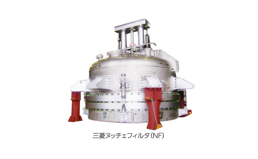 ヌッチェフィルタは、密閉容器内部の水平ろ板にろ布を取り付けた加圧(または真空)ろ過機で、油圧シリンダにより上下に可動する撹拌羽根を備え、ろ過、洗浄、乾燥、ケーキの排出までを一台で効率よく行うことができる装置です。