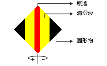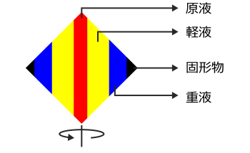 - 液-液-固体の三相分離、または液-液の2相分離で2種の比重の異なる混合液の分離に使用されます。