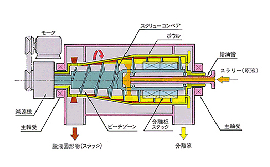 - 分離板型デカンタはボウル、沈降固形物を連続的に排出するスクリューコンベアと、これらに相対差速を与える減速機の三要素で構成されています。
